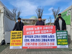 [아파트관리신문=고현우 기자] “경비회사 변경 시 경비노동자의 고용승계를 법으로 보장하라!”경비회사 변경 시 경비노동자의 고용승계 문제가 다시금 관리현장의 화두로 떠오르고 있다. 전국민주노동조합총연맹 전국민주일반노동조합과 전국아파트경비사업단이 지난달 21일부터 국회로 들어서는 입구 곳곳에서 경비노동자 고용승계 보장 입법을 촉구하는 1인 릴레이 시위를 펼치고 있기 때문이다.경비노동자는 은퇴 이후의 고령 남성들이 생계를 유지할 수 있는 ‘마지막 일자리’로 불린다. 그러나 이들에 따르면 경비회사 변경 시 계약 종료, 1·3·6개월 단위의