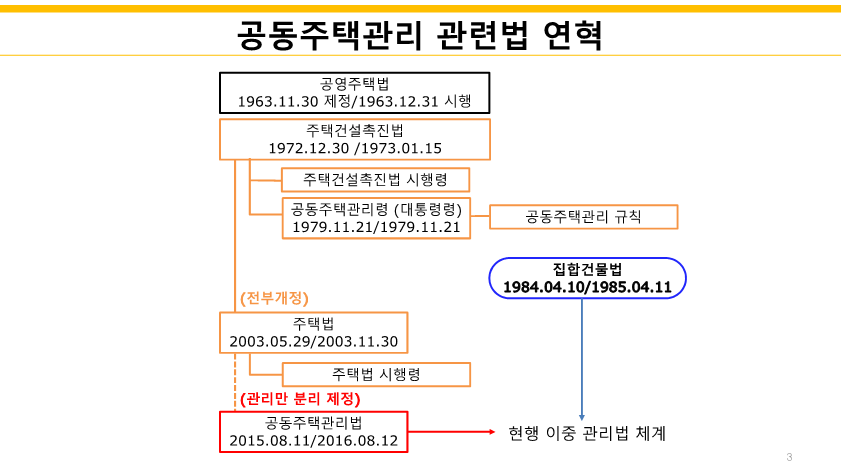 이번 이슈브리핑 첫 시간에는 공동주택관리법에 대한 내용을 준비했습니다. 법의 연혁과 기본적인 구조를 살핍니다. 이번 기회를 통해 그동안 단편적으로 알고 있던 공동주택관리법에 대한 지식들이 체계적으로 정리될 수 있길 바랍니다.