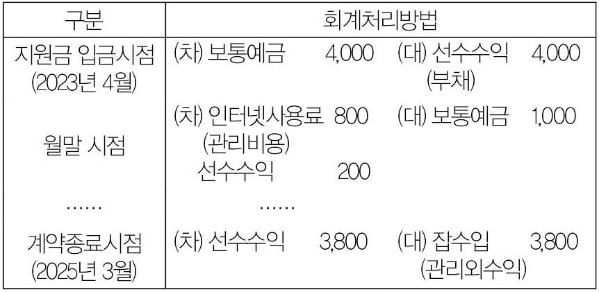 예를 들어 2023년 4월에 인터넷단체계약을 체결하고 지원금 4000원을 받았으며 매월 인터넷사용료로 1000원을 납부하며 인터넷을 사용하는 각 호실로부터 800원을 징수해 오고 있으며 2025년 3월 중 거래가 종료됐다고 가정하는 경우의 시점별 회계처리방법은 다음과 같게 된다.