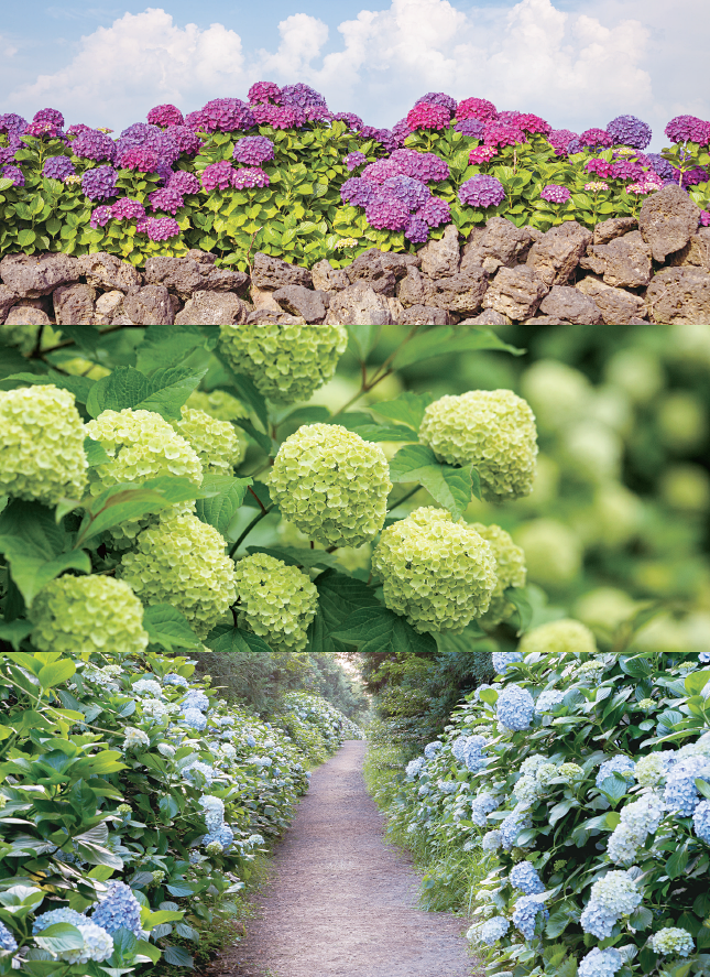 수국꽃은 초여름에서 무더운 여름 중순까지 약 2개월~3개월 꽃이 핀다. 비교적 개화기간이 긴 편으로 많은 사람들에게 볼거리와 즐거움을 준다. 예전에는 주로 화분에 심었지만 요즘은 정원에 수국을 심고 가꾸는 곳이 많고 제주도를 비롯해 전국 각 지역에서 여름 수국 축제를 열고 있다. 우리나라는 사계절이 뚜렷하고 여름에는 습하고 겨울에는 추운 기후라 환경에 맞는 수국을 선택해야 한다. 수국의 특성을 알아야만 꽃을 제대로 피울 수 있기 때문이다. 수국의 종류에 따라 기후, 토양, 관리 수준이 다르지만 가장 신경 써야 할 부분은 가지자르기와 겨울 추위 보온 처리다. 그 해 난 가지에서 꽃을 피우는 수국(당년지수국)인지, 전년도 가지에서 꽃눈이 맺는지, 겨울 추위에 보온 처리를 해야 하는지 등 수종별로 특성을 이해하고 그에 맞게 관리해야 잎만 무성한 깻잎 수국이 되지 않는다.
