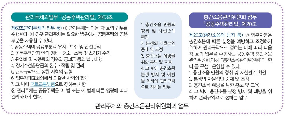 그렇다면 관리주체의 입장은 어떠할까. 층간소음관리위원회가 입주민 자율의 틀에서 구성되지 않는다면 사실상 대부분의 행정지원은 관리주체가 담당하게 된다. 층간소음 예방 안내, 1차 민원 접수 및 응대 등은 과거부터 관리주체의 몫이었다. 그런데 이번 제도 의무화로 인해 위원회 구성원 모집, 회의자료 준비, 회의록 작성 등 위원회 운영을 위한 전반적의 업무까지 관리주체가 도맡게 된 상황이다. 또한 관리주체가 위원으로 포함되도록 하고 있어 구성원 부족 시 입주민 간 중재 역할까지 떠맡아야 할 처지에 놓일 수도 있다.