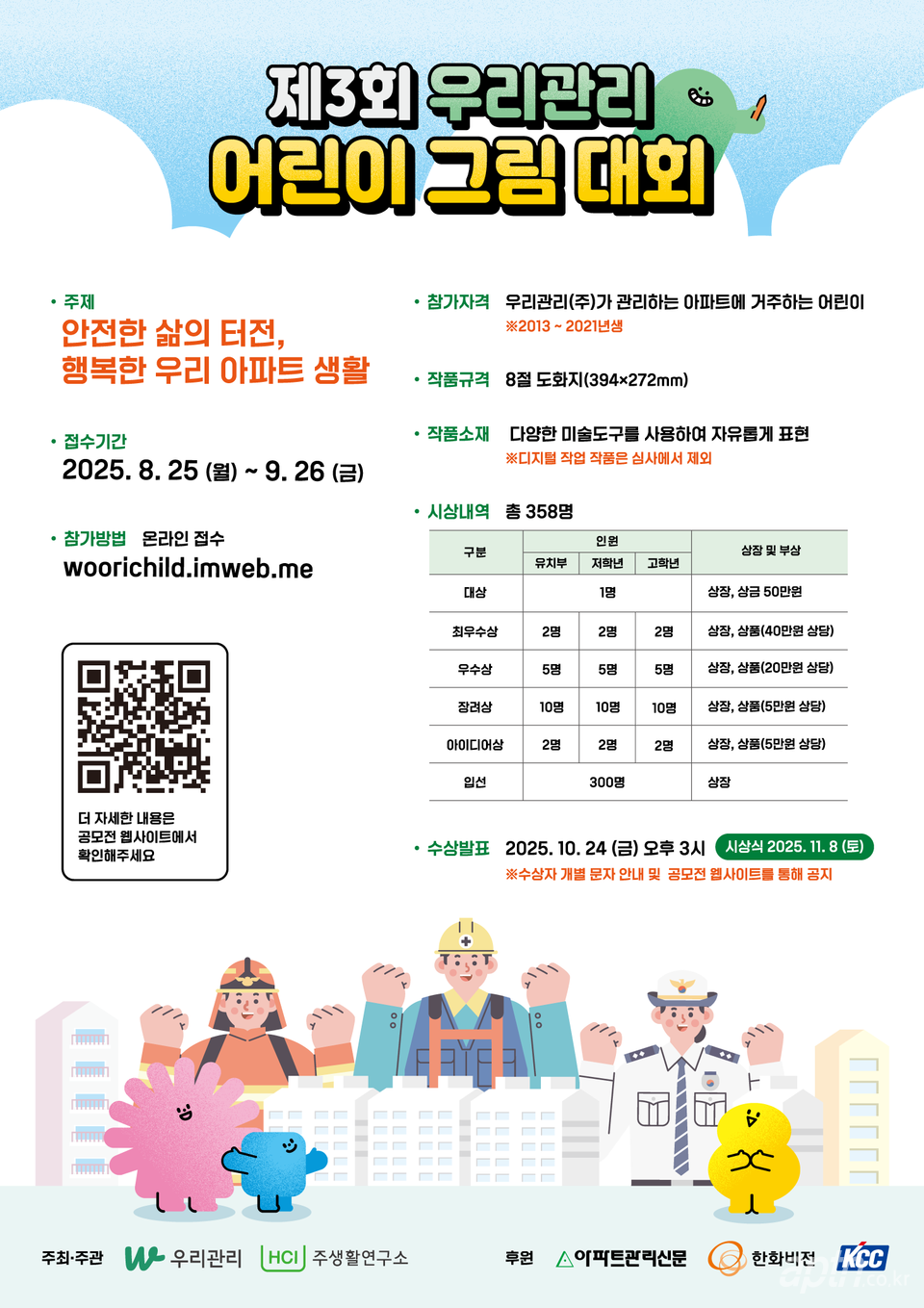 [아파트관리신문=고현우 기자] 우리관리가 주최하고 주생활연구소가 주관하며 아파트관리신문, 한화비전, KCC가 후원하는 ‘제3회 우리관리 어린이 그림 대회’가 25일부터 다음 달 26일까지 개최된다. 이번 대회는 미래의 입주민인 어린이들이 그림을 그리기 위해 주제에 대해 고민하고 대상을 관찰하는 과정을 통해 공동주택의 안전과 공동체 문화를 자연스럽게 이해할 수 있도록 하고 입주민 친화적 기업으로서 사회적 책임을 실천하기 위해 마련됐다.