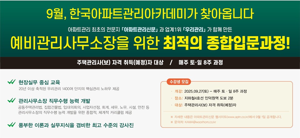 매주 토·일 8주 과정의 ‘예비관리사무소장 종합입문과정’은 9월 27일부터 시작되는 1차 과정에 이어 12월 6일부터 2차 과정이 진행된다. 신청 접수는 9월 1일부터 시작되며 이날 아파트관리신문 웹사이트(www.aptn.co.kr)에서 자세한 사항이 공개될 예정이다.