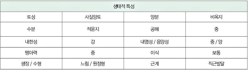 아래 표의 생태적 특성을 참고하면 가장 적합한 식재지를 선택할 수 있다. 아파트에서는 주거동 전면, 주거동 주변, 주차장 주변, 외곽녹지 등이 식재 대상지로 적합하다.