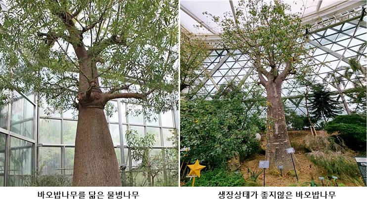 바오밥나무는 우리나라에서 자연적으로는 살 수 없고 식물원에서나 볼 수 있다. 얼마 전 서울식물원에 있는 바오밥나무를 보러 갔을 때 지중해의 기후에 맞춰 온도와 습도를 조절하고 있음에도 나뭇잎이 누렇게 변하고 있었다. 그 모습에 우리나라의 한겨울을 아프리카의 서늘한 가을처럼 체감하고 있지는 않은지 나무에게 묻고 싶었다.