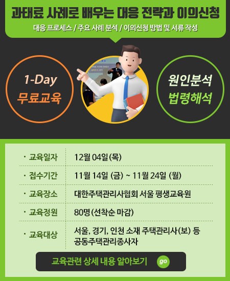 [아파트관리신문=서지영 기자] 대한주택관리사협회는 공동주택 관리사무소장들이 직면할 수 있는 행정처분 및 과태료 문제에 효과적으로 대응할 수 있도록 ‘과태료 사례로 배우는 대응 전략과 이의신청’ 교육을 다음달 4일 서울 금천구 협회 평생교육원에서 실시한다.