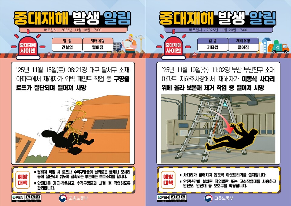 중대재해사이렌은 이같은 사실을 전파하며 사다리가 넘어지지 않도록 아웃트리거를 설치하고 안전난간이 설치된 작업발판이나 고소작업대를 사용하며 안전모 등 보호구를 착용할 것을 권고했다.
